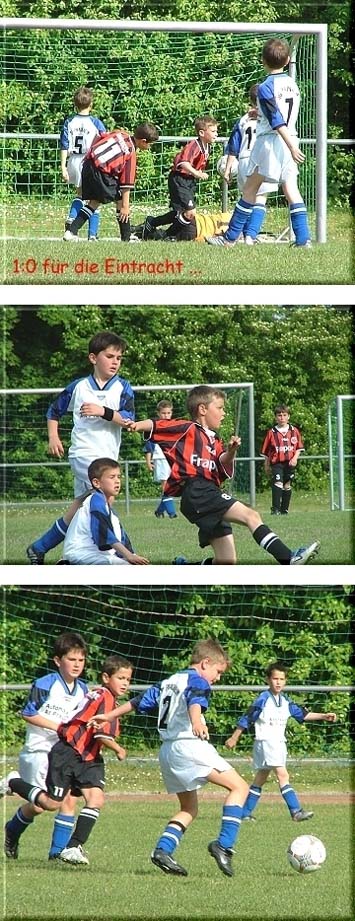Noch alles war drin. Dann lief die Angriffsmaschine der Eintracht auf Hochtouren und die Tore fielen im 3-Minuten–Rhythmus. Schließlich gewannen die Jungens der Frankfurter Eintracht 10:0 und feierten nach dem Schlusspfiff mit Eltern und Betreuern zusammen ausgelassen den inoffiziellen Gruppensieg. Glückwunsch sowohl an die Eintracht als auch nach Oberrad!